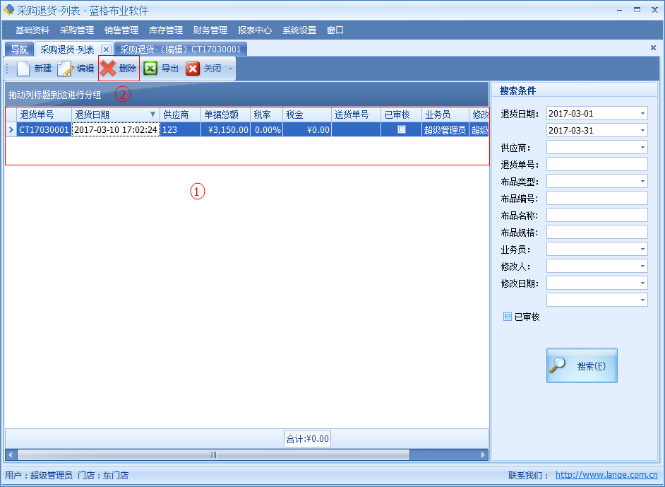 如需要對(duì)采購(gòu)?fù)素浿心骋粭l數(shù)據(jù)進(jìn)行刪除的,通過(guò)采購(gòu)?fù)素浟斜磉x中一條記錄點(diǎn)擊【刪除】按鈕,刪