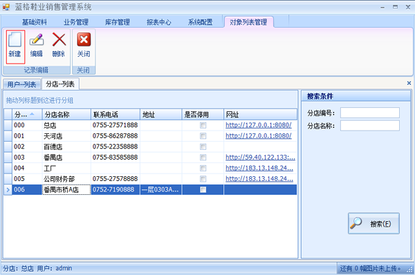 點(diǎn)擊【基礎(chǔ)資料】->【分店】打開分店-列表,這里顯示全部的分店信息。點(diǎn)擊【新建】進(jìn)入分店配置頁面。