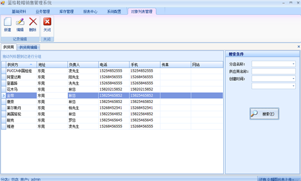 點(diǎn)擊【基礎(chǔ)資料】->【供應(yīng)商】, 打開供應(yīng)商列表界面,該界面可以進(jìn)行查詢,查詢相關(guān)的供應(yīng)商信息,雙擊該供應(yīng)商打開供應(yīng)商詳細(xì)信息界面。包括編輯供應(yīng)商,刪除供應(yīng)商和建立新的供應(yīng)商三個(gè)功能。如下圖: