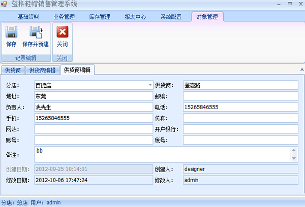 在上圖中點(diǎn)擊【新建】打開供應(yīng)商編輯界面。添加好供應(yīng)商相關(guān)的信息。然后點(diǎn)擊【保存】這樣就把供應(yīng)商錄入到系統(tǒng)中。當(dāng)在上圖中選擇一個(gè)供應(yīng)商點(diǎn)擊【編輯】,在該界面中會(huì)顯示選擇供應(yīng)商詳細(xì)的信息,修改其中的項(xiàng)目,然后點(diǎn)擊【保存】,供應(yīng)商的信息就更新完成。
