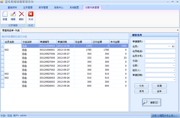 點擊【業務管理】->【零售列表】, 打開零售單據列表界面,該界面可以進行查詢,查詢相關零售單的信息,雙擊該單據打開零售詳細信息界面。零售單據列表界面包括編輯零售單,刪除單據和建立新的單據三個功能。如下圖: