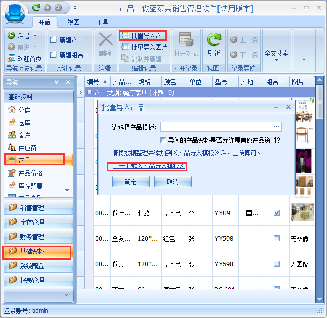 ④將修改好的家具產(chǎn)品資料信息導(dǎo)入到軟件中,點(diǎn)擊【批量導(dǎo)入產(chǎn)品】,選中修改后的①的產(chǎn)品信息表格,將產(chǎn)品資料導(dǎo)入至系統(tǒng),如圖: