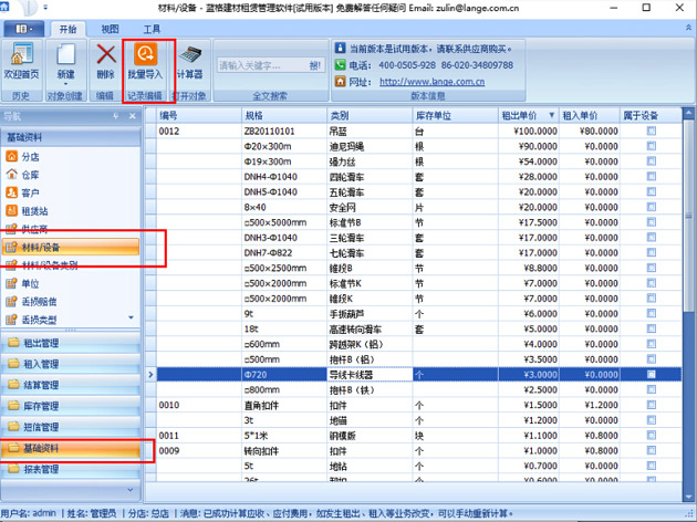 傲藍建筑租賃管理軟件可以從模板批量導入材料/設備的數據,節省了客戶在剛試用軟件必須去一個個建立基礎資料的時間。