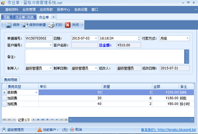 在冷庫的運營過程中,除了冷藏費,搬運費等常規的費用以外。有時冷庫也會幫助貨主處理一些其他業務,并且收取一定的手續費及人工費。如分揀,貼標簽,打包裝等。如果是發生在進出庫時候,在傲藍冷庫信息管理系統的入庫單和出庫單登記上雜費即可。
