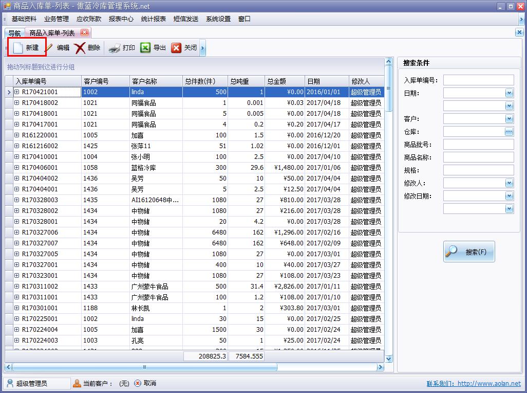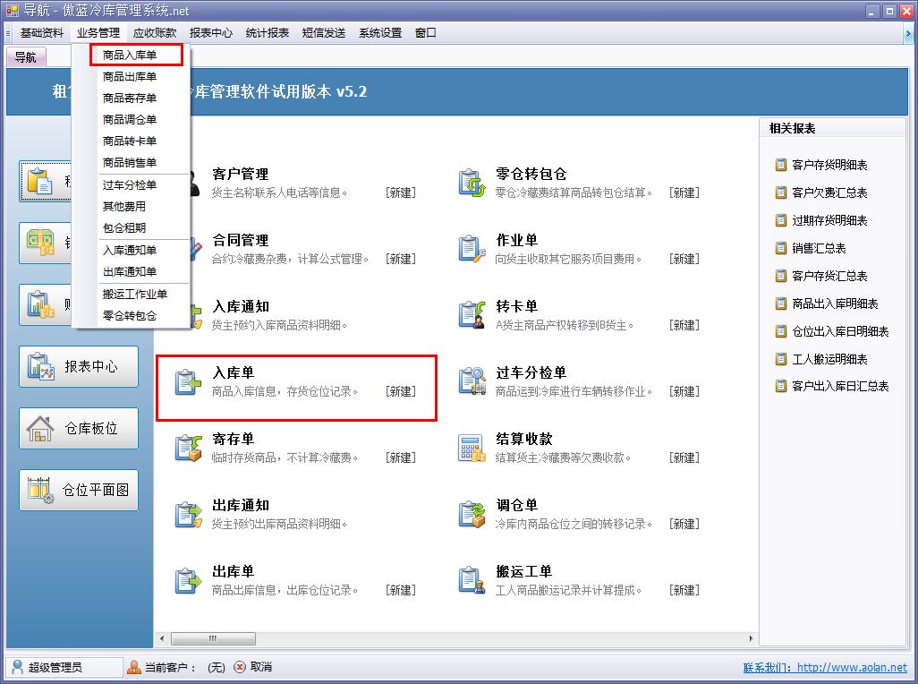 傲藍冷庫倉儲管理軟件,商品入庫功能,系統可分倉庫,按照商品批號管理,自動計算操作費用。系統采用冷藏費和操作費分離計算的方式。