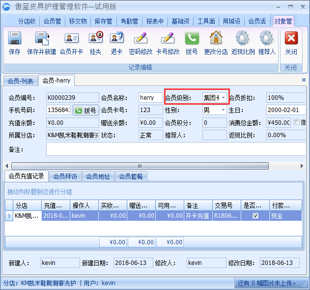 2、軟件以會員級別的方式限制會員是否是集團員工,所以在軟件建立會員資料時,選擇“會員級別”為“集團卡”即可將該會員劃分到集團管理,并確認會員所屬的集團。軟件實現只有集團會員才能使用集團支付,如圖: