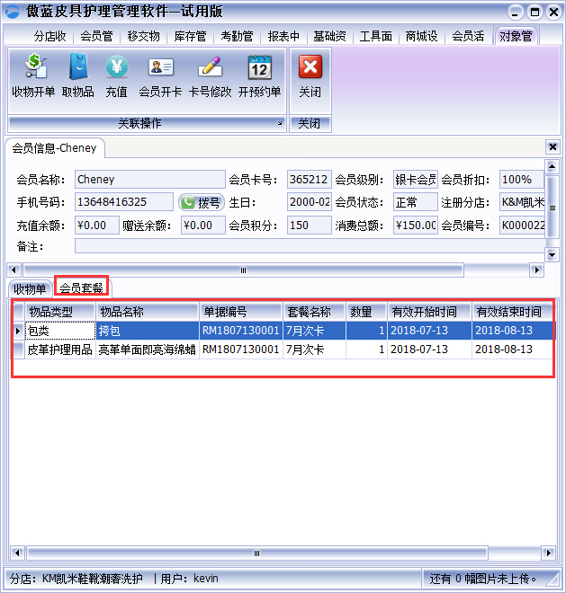 2、會員購買的套餐有所消耗之后,需要查詢會員剩余的套餐數量,可以在傲藍皮具護理店管理系統中的會員詳細信息中【會員套餐】中進行查看,如圖: