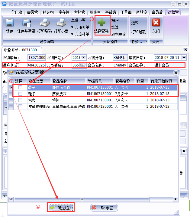 店員在傲藍皮具護理店系統給會員開單消費的具體操作步驟: