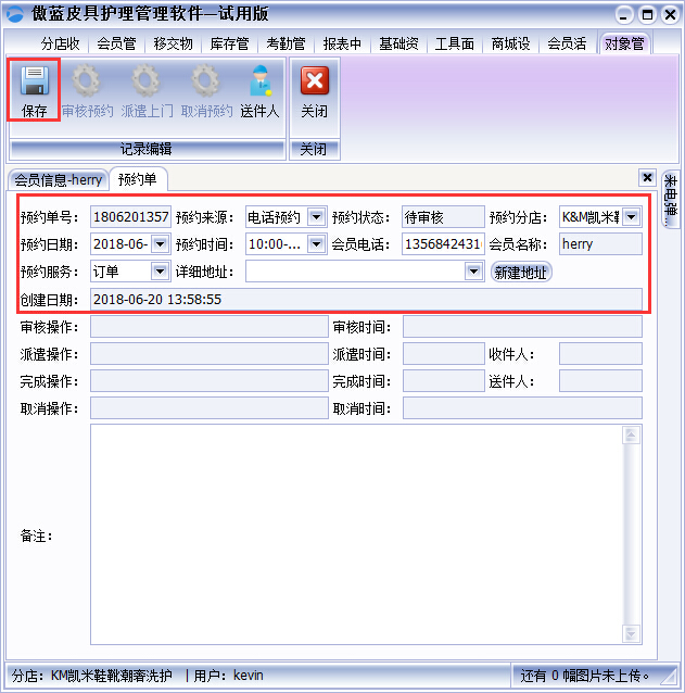 在彈出的會員信息界面,可以新建預約單,進入預約單詳細界面,人工輸入預約基礎信息與項目,點擊“保存”即可完成預約單,預約審核與派遣上門的操作,如圖: