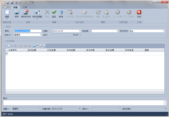 1打開傲藍汽車配件銷售店管理軟件【庫存管理】——【付款單】,出現主界面如下所示: