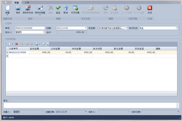 選擇供應商,此該用戶所有需要付款的采購入庫單,費用都會自動顯示到付款明細中,如下選擇“天津華獅汽車儀表有限公司 ”付款明細中會自動填充付款的一條記錄,如下圖所示: