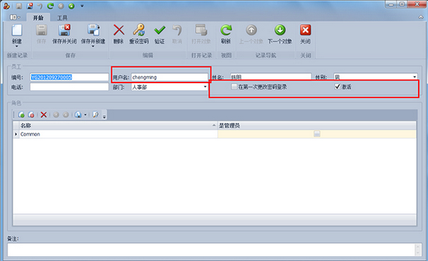 第2步、點擊工具欄的“新建”按鈕,彈出新建員工詳細界面,輸入員工姓名、用戶名(登錄賬號),密碼默認為空,如果選中“次登錄修改密碼”,則在次登錄的時候會顯示修改密碼對話框。選中“激活”表示員工能夠登錄系統,否則員工不能登錄系統。